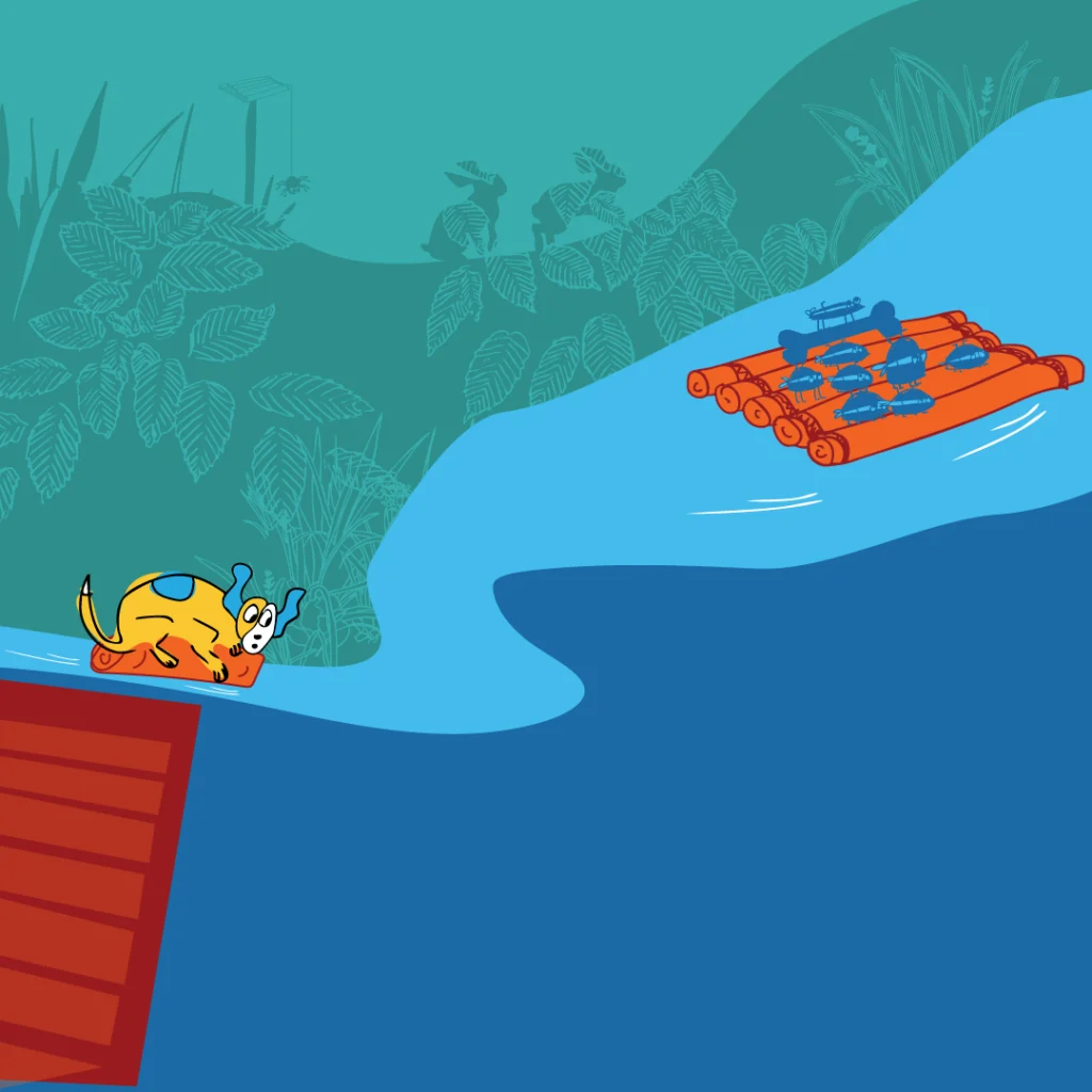 He nervously ventures on and meets the terrible toad, who suggests they have dinner together. Rip is now faced with being eaten up or braving the fast-flowing stream, he can see in the distant the ladybirds on a raft fleeing with his bone. He takes a chance, jumps onto a log and is swept along. The story ends with a twist…..