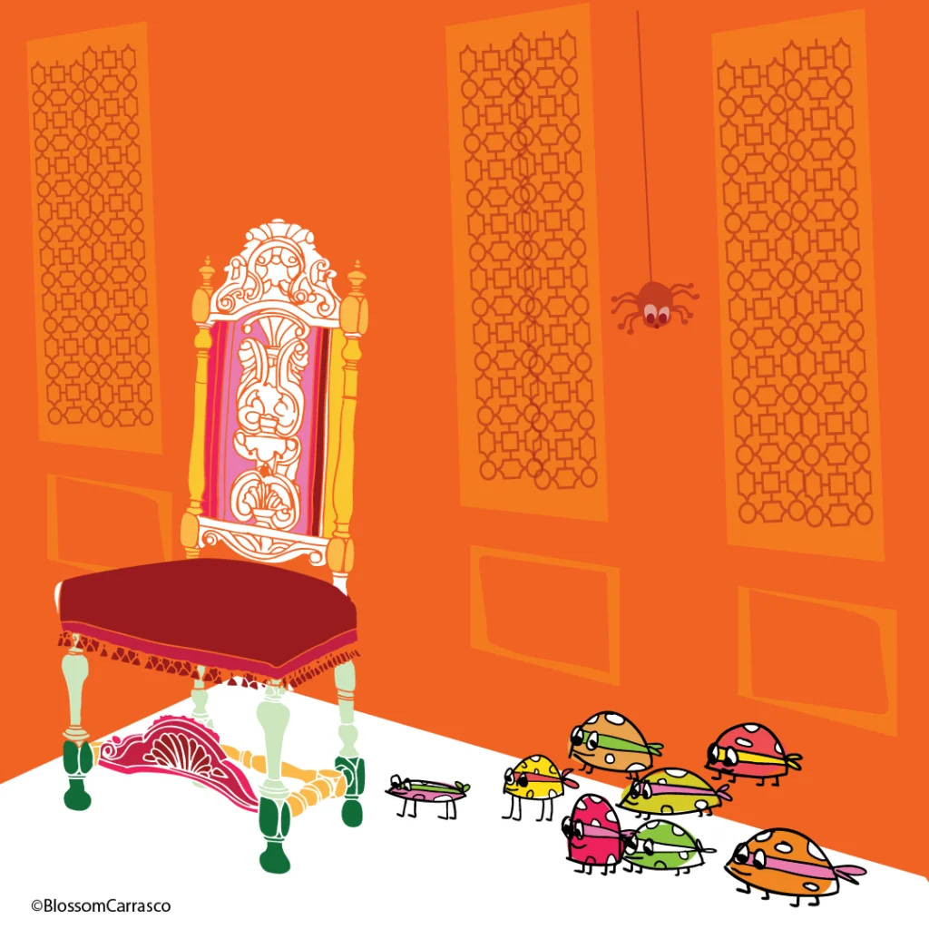 The story is centred around Rip’s attempt to retrieve his bone from a band of naughty ladybirds. His journey takes him through the kitchen’s fireplace, down a dark tunnel then falling through a secret door. Here he meets Bee (and friends), but they can’t help, they point him in the direction the ladybirds went.